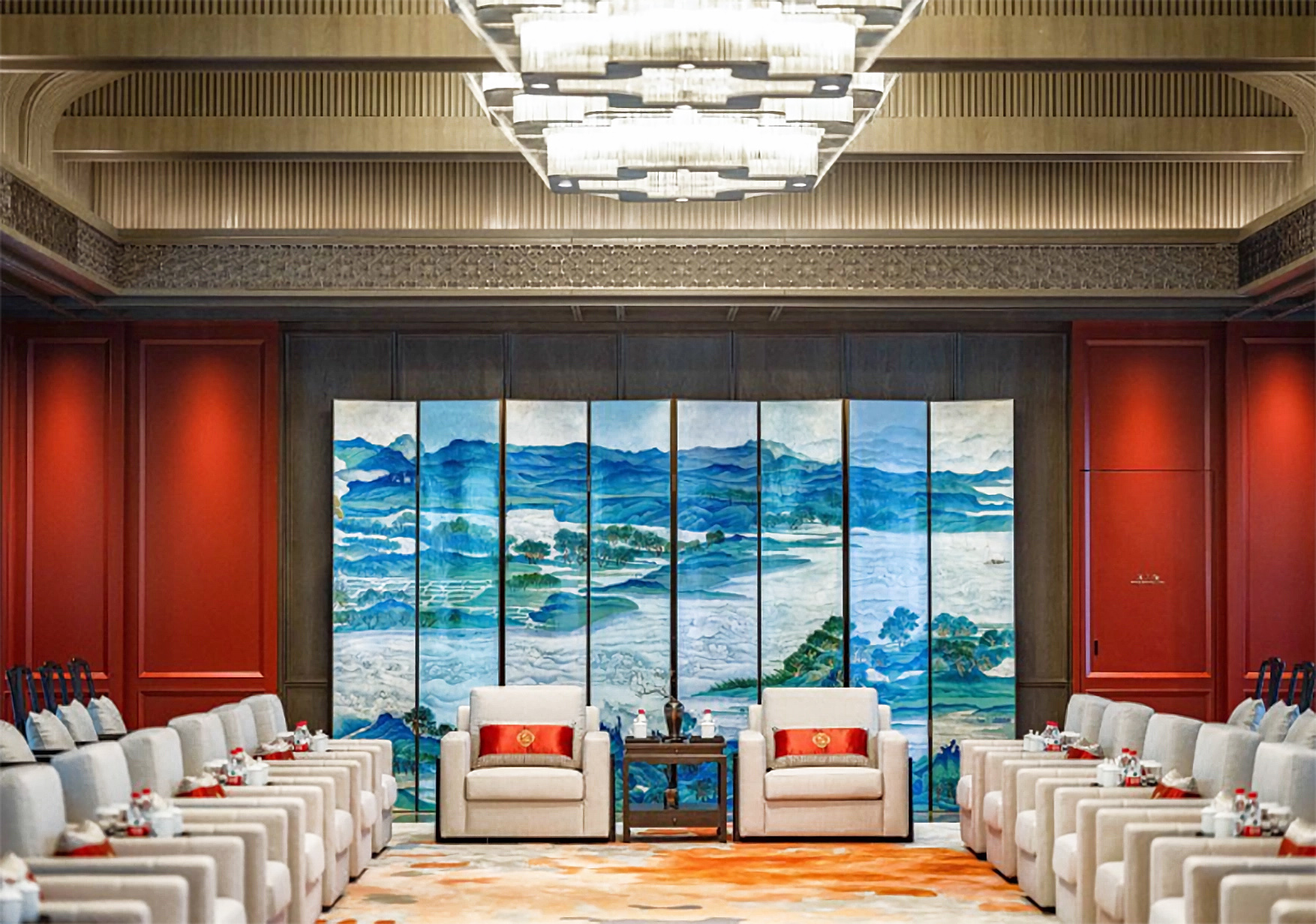 益大丝业会馆对公共区域的营造和共享空间的设计十分细致,会馆的茶室、书画区、宴会厅、会务区独到的刺绣画作、工笔手绘,竹简卷轴、