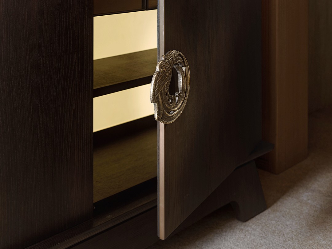 柜身中央的团凤金属图腾,从古代玉器、青铜器、木雕纹样中汲取灵感,以古铜浮雕工艺重塑 “凤环于圆” 的经典意象。