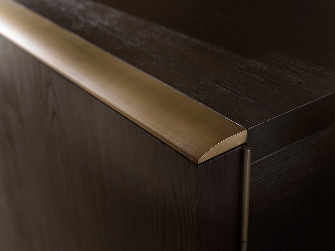 金属元素(图腾拉手、柜门中缝及柜侧金属线、柜顶金属饰面)与实木碰撞共生:金属的精致光泽为实木的厚重增添灵动,实木的温润纹理又柔化了金属的冷硬,在 “材美工巧” 的传统造物观中,融入现代 “质感集成” 的美学表达。