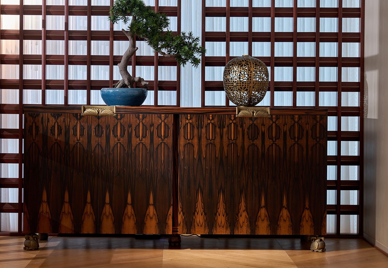 古铜图腾与实木工艺相衬,让东方图腾的神秘与现代设计的雅奢相融,既承载收纳功能,更成了空间里讲述传统美学的艺术载体。