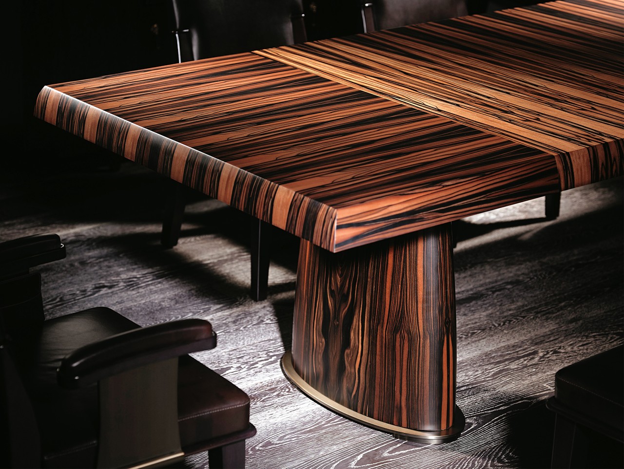 简而有境的形态张力:融刚柔之美,整体遵循 “减法设计”;Ultra长桌轮廓简洁利落,却在桌腿形态中暗藏张力:柱形桌腿从底部向中部微微舒展,暗合传统木作 “收分” 的韵律智慧,简约桌面与富有张力的桌腿形成平衡。椭圆形的金属桌脚元素为东方意趣注入灵动感、精致感。