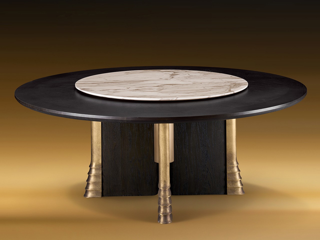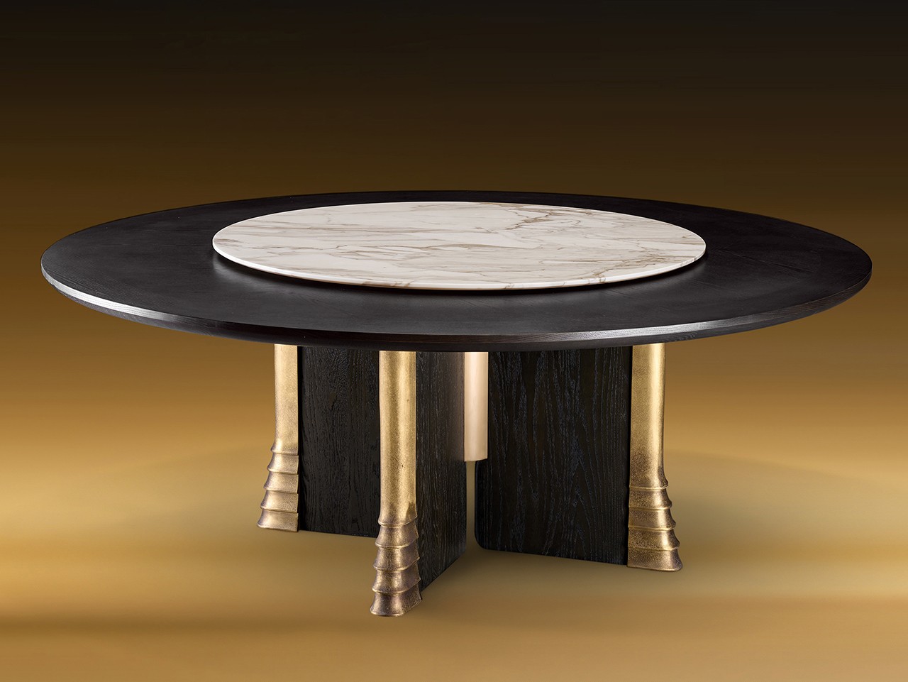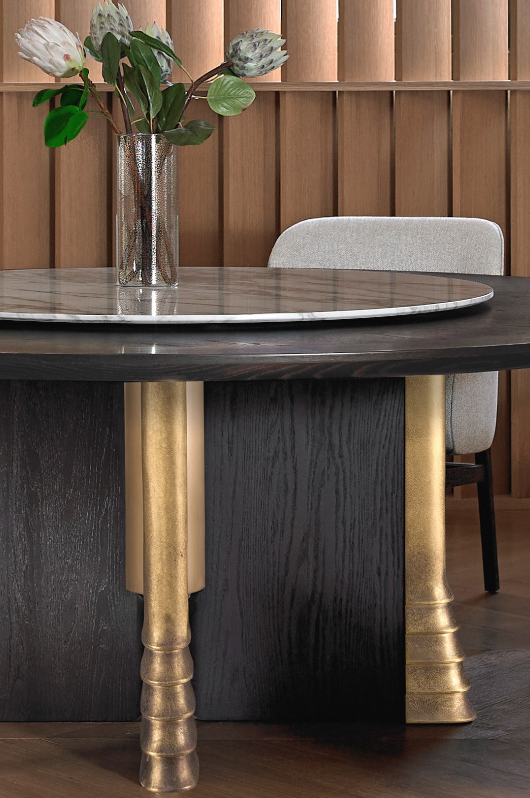如墨玉般雕琢的木质圆桌盘,延续团圆寓意,外加十字形基底承托,承续中式木作的稳固机构;中央大理石的清润纹理,中和木的沉与金的贵,让 “圆盘的厚朴、石纹的清透、金蹄的锐意” 三者交织,构成一曲材质的和鸣,达成现代中式美学的平衡。