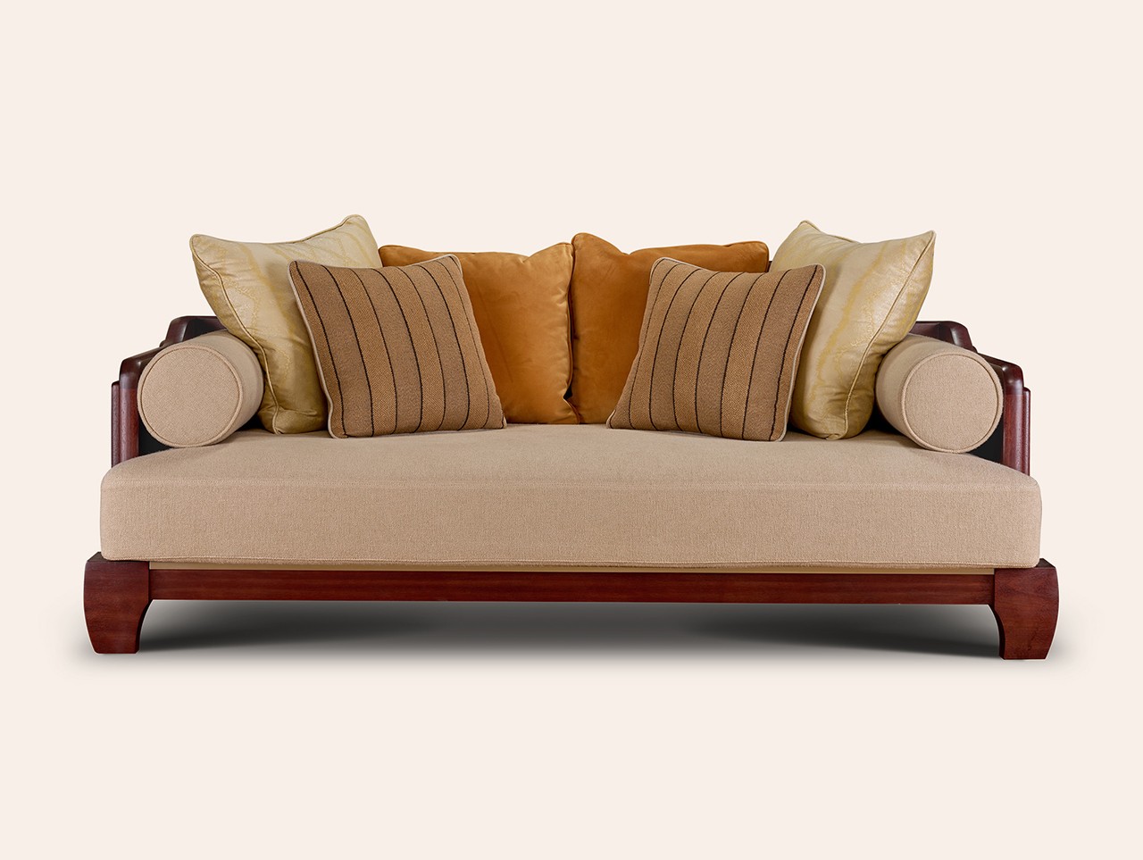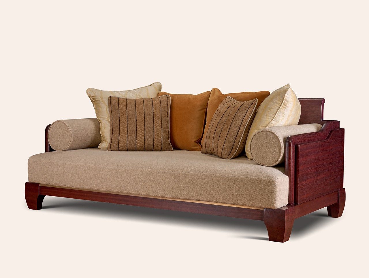 传统形制的现代演绎:沙发借古 “榻” 之形,予人松弛的依靠,实木框架将“榻”的舒展、稳重,化作了可栖居的日常,腿部曲线暗合传统家具 “马蹄足”“束腰” 的韵味,传递出 “坐有仪范” 的东方礼仪感;同时以简洁线条消解传统家具的厚重感,让古典韵味在现代造型中轻盈呈现。