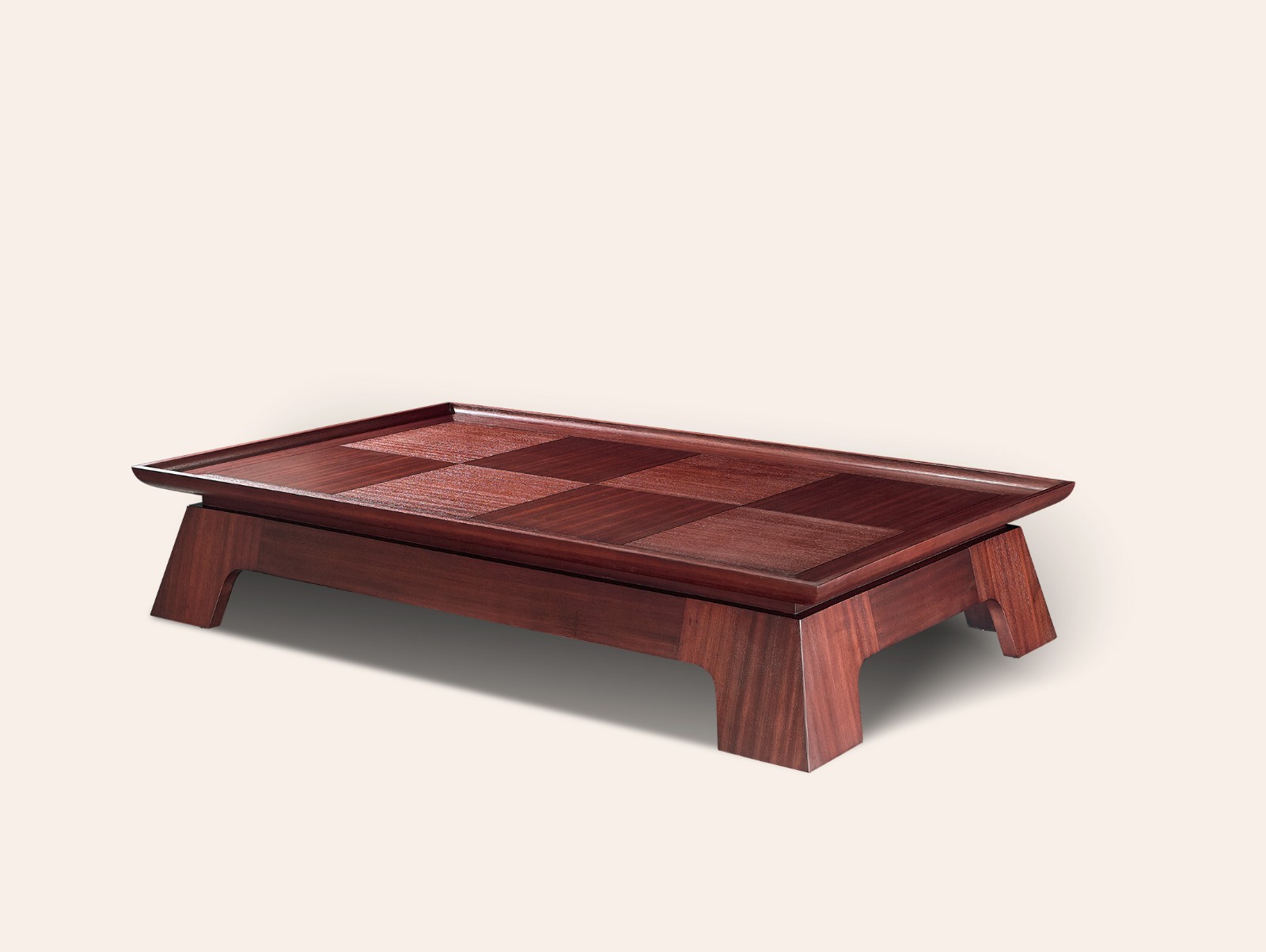 借鉴传统 “矮榻案几” 的低矮舒展形态,及“须弥座”基座稳固托举的形态,提升空间美学设计。茶几面又以“托盘式” 造型边缘微翘,良好实现精致聚拢物品。宽厚实木腿简洁有力,呼应中式家具 “敦实稳重” 气质,与沙发搭配营造松弛围合的交流氛围。
