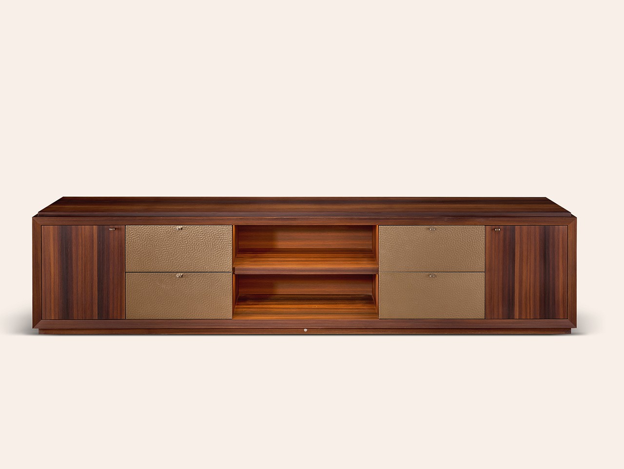 电视柜/地柜采用对称式布局,呼应“均衡和谐” 的礼仪感;中间开放式隔层与左右封闭柜延续中式 “藏露相宜” 的空间美学。