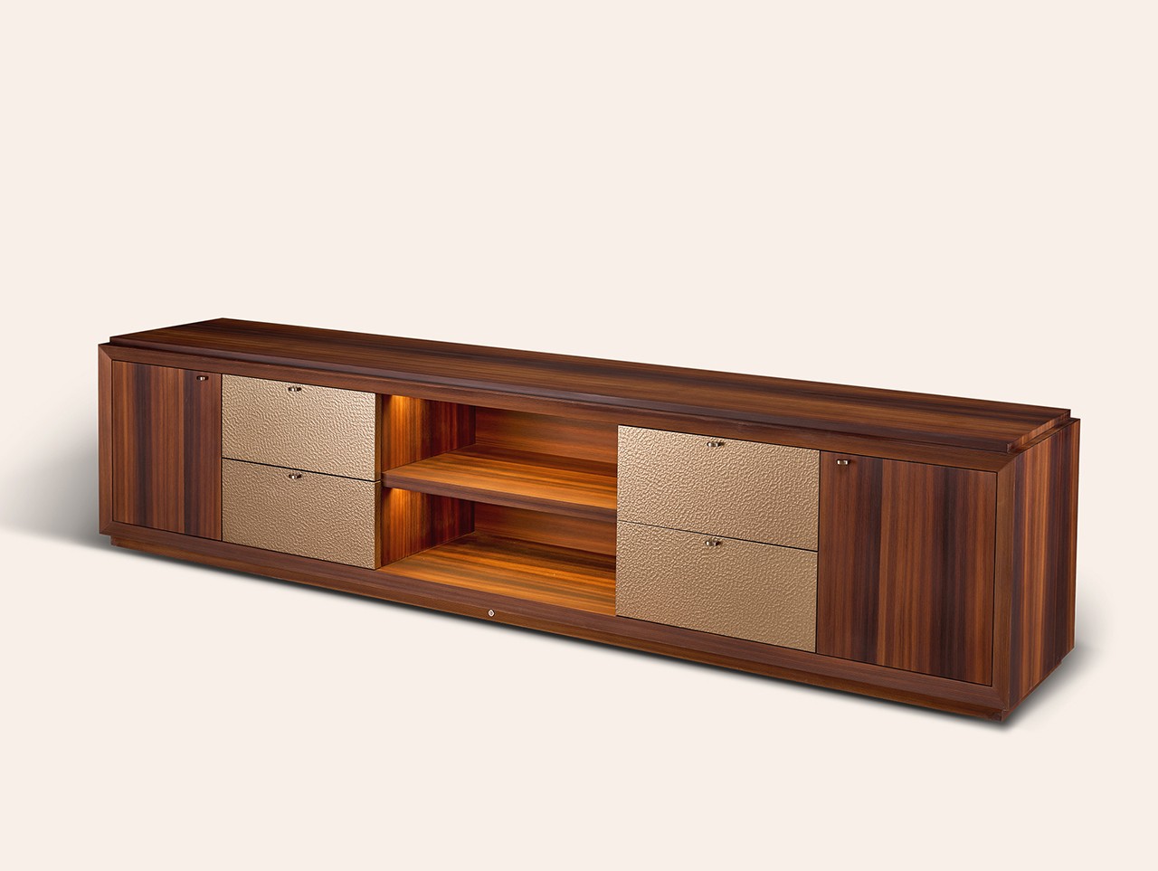 锤纹金属面板的明暗交替,熠熠生辉、精致的金属拉手,进一步强化工艺质感,也流露出现代中式的精致与考究,为实木注入现代轻奢质感,让传统木作在材质碰撞中焕发新生。