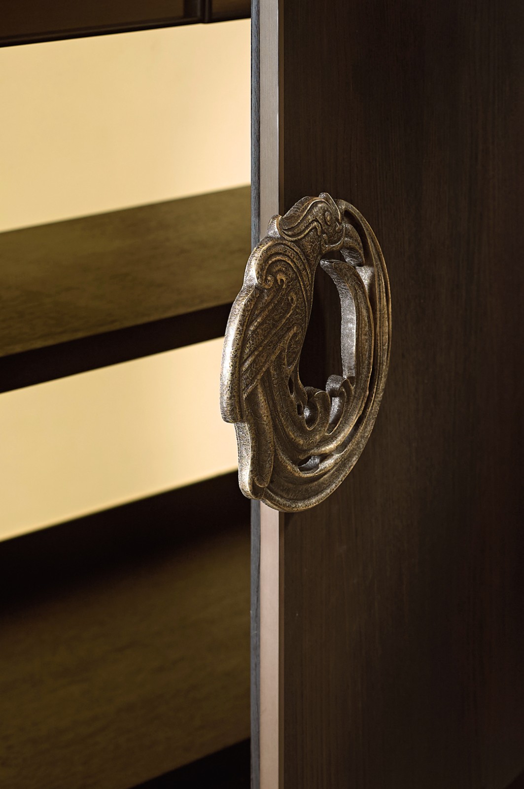 柜身中央的团凤金属图腾,从古代玉器、青铜器、木雕纹样中汲取灵感,以古铜浮雕工艺重塑 “凤环于圆” 的经典意象。