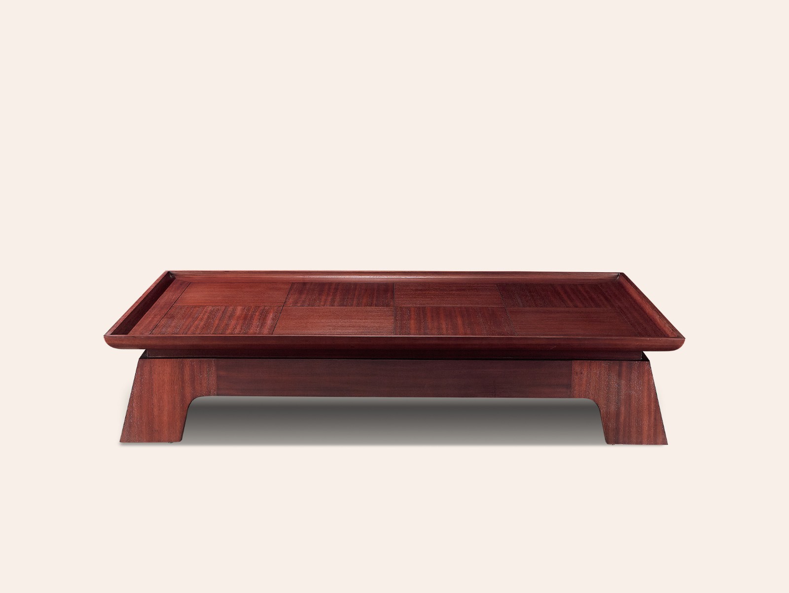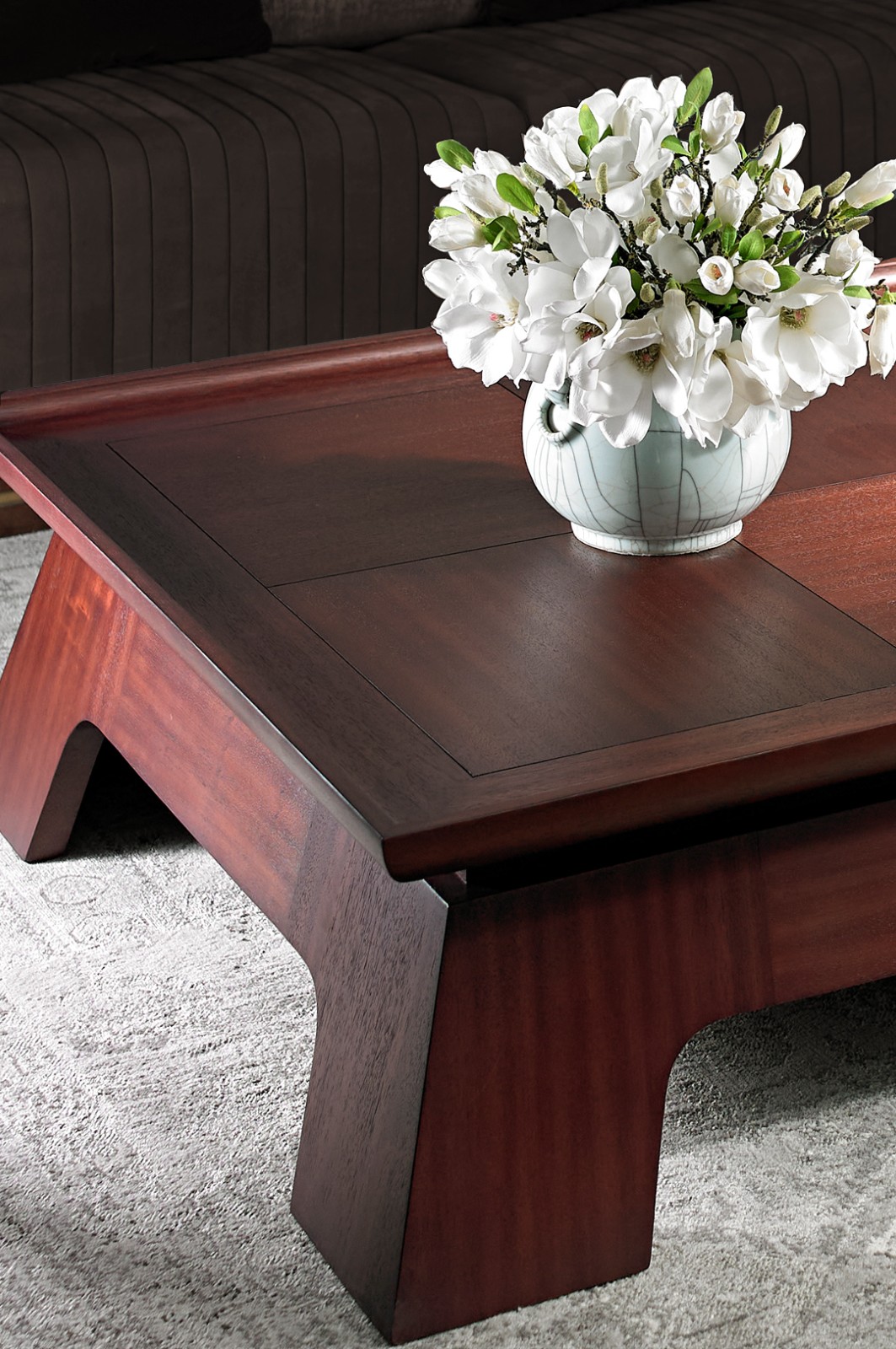借鉴传统 “矮榻案几” 的低矮舒展形态,及“须弥座”基座稳固托举的形态,提升空间美学设计。茶几面又以“托盘式” 造型边缘微翘,良好实现精致聚拢物品。宽厚实木腿简洁有力,呼应中式家具 “敦实稳重” 气质,与沙发搭配营造松弛围合的交流氛围。